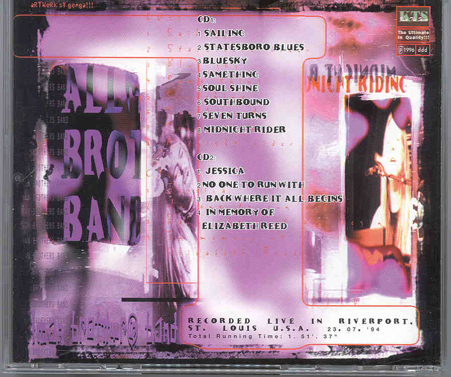 Allman Brothers Band Midnight Riding Riverport St. Louis USA July 23rd 1994 KTS 2 CD SET Allman Brothers Band Midnight Riding ( Riverport , St. Louis , USA , July 23rd , 1994 ) ( KTS ) ( 2 CD SET )