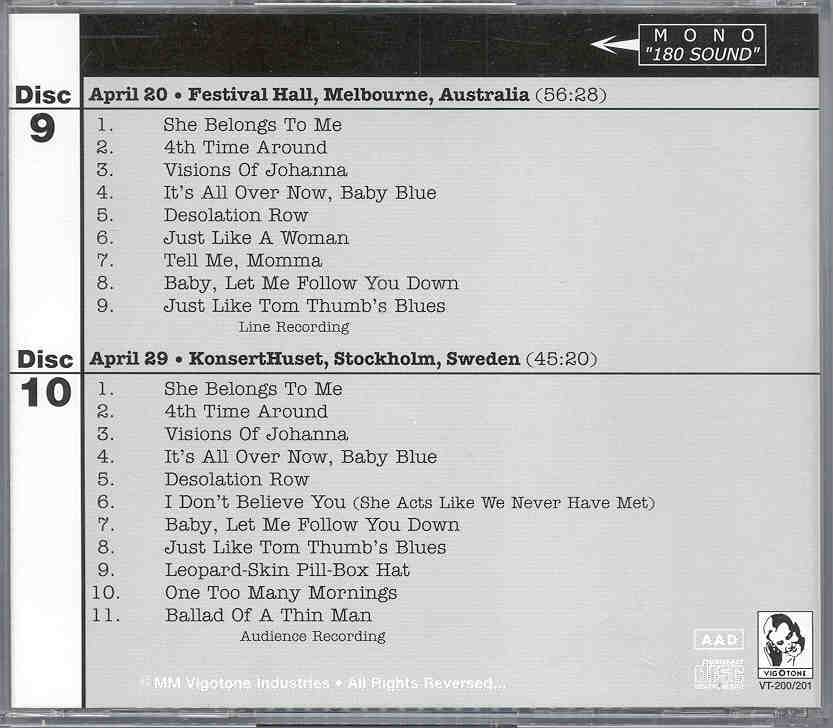 1. She Belongs To Me 2. 4th Time Around 3. Visions Of Johanna 4. It’s All Over Now, Baby Blue 5. Desolation Row 6. I Don’t Believe You (She Acts Like We Never Have Met) 7. Baby, Let Me Follow You Down 8. Just Like Tom Thumb’s Blues 9. Leopard-Skin Pill-Box Hat 10. One Too Many Mornings 11. Ballad Of A Thin Man Audience Recording