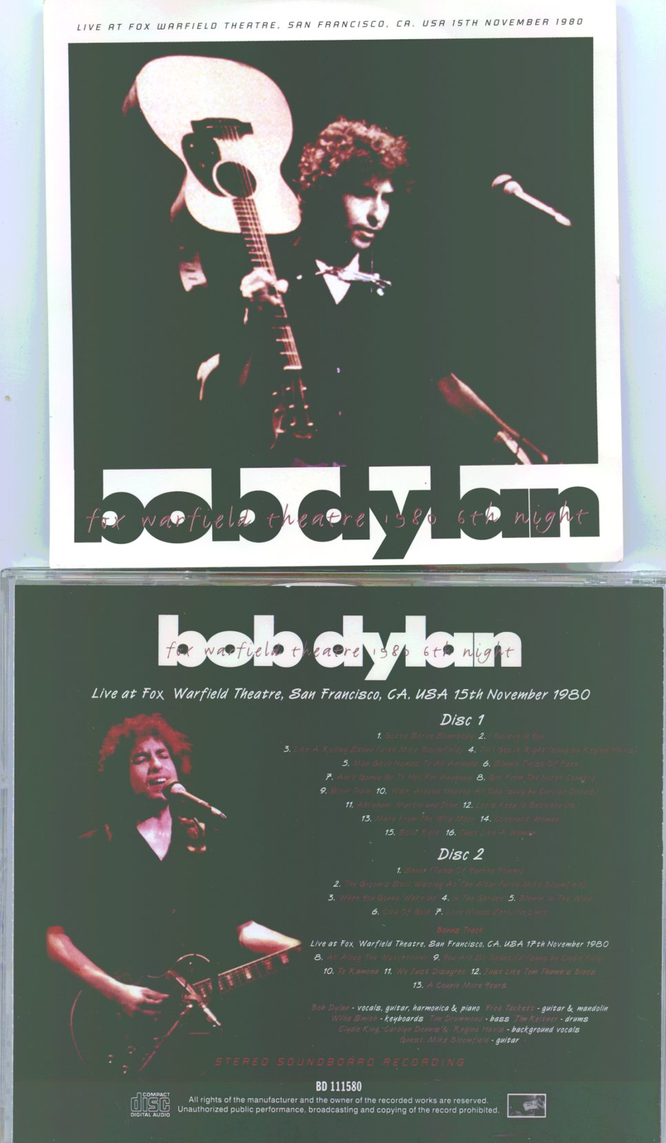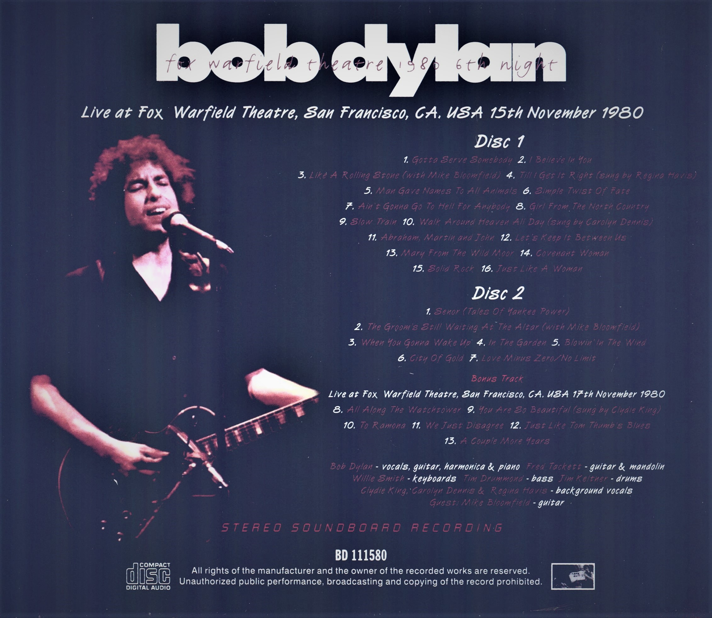 Bob Dylan Fox Warfield Theatre 1980 6th Night 2 CD SET Live at Fox Warfield Theatre San Francisco CA USA November 15th 1980 Bob Dylan Fox Warfield Theatre 1980 6th Night ( 2 CD SET ) ( Live at Fox Warfield Theatre, San Francisco, CA, USA, November 15th, 1980 )