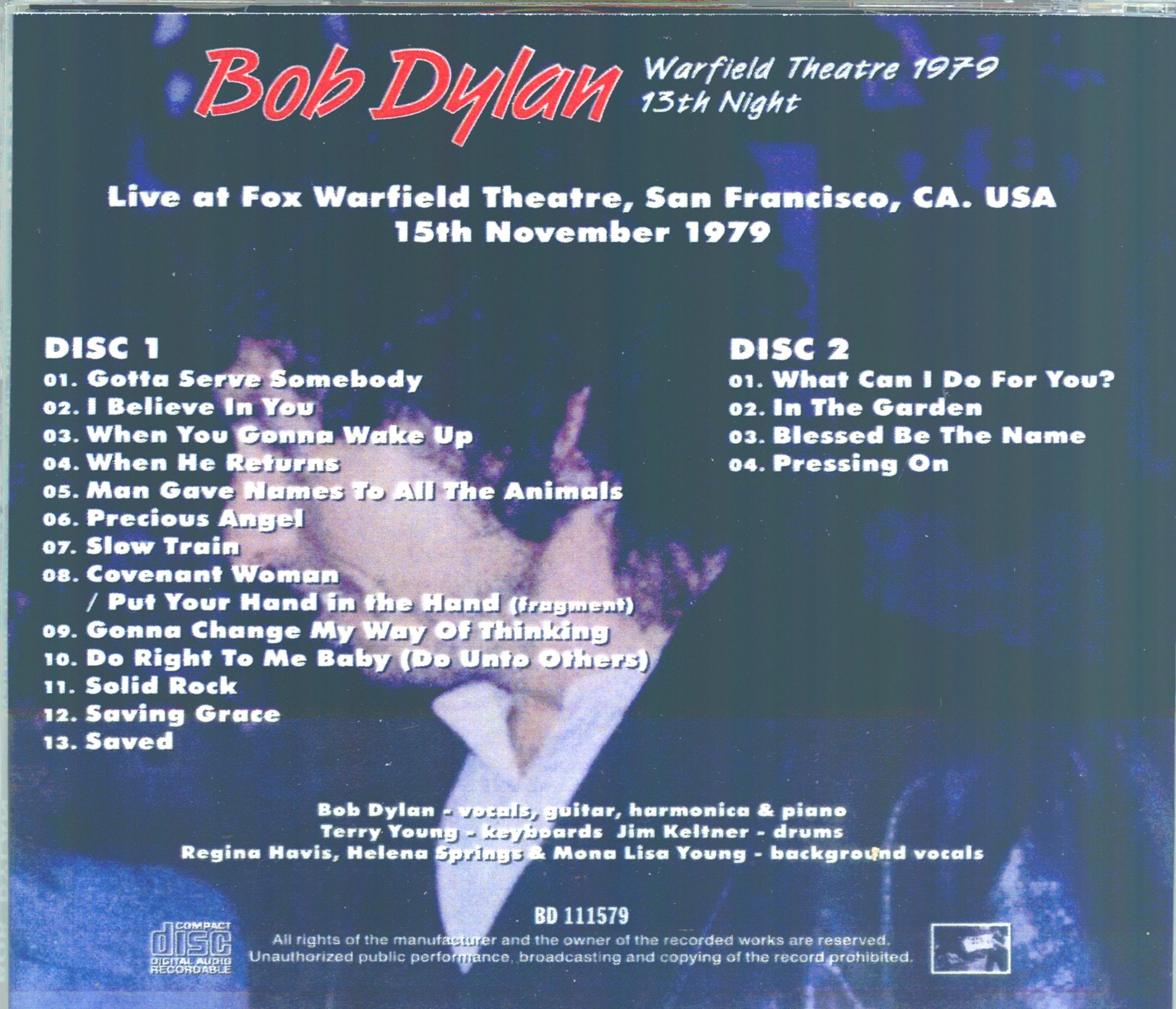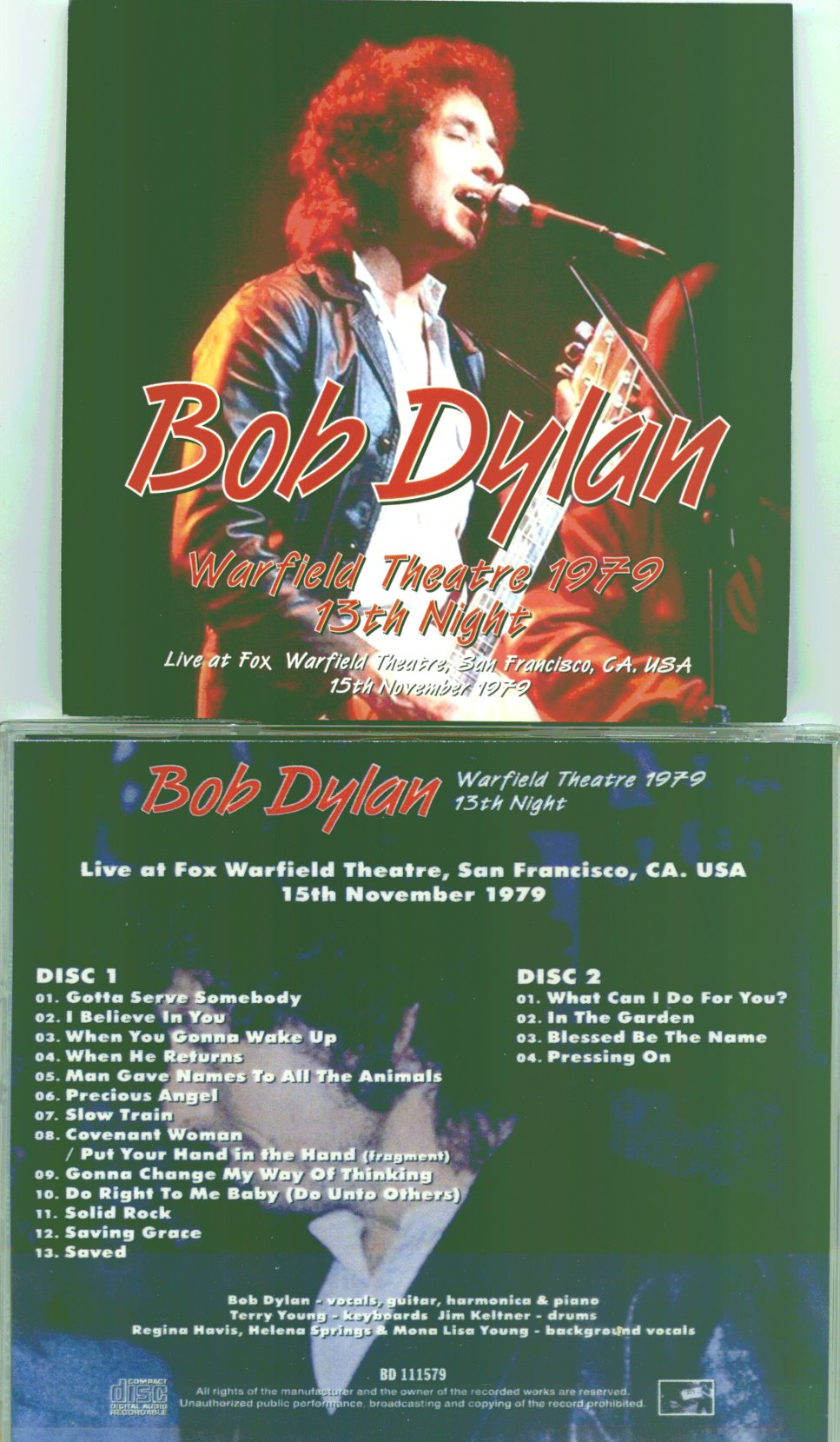 Bob Dylan Warfield Theater 1979 13th Night 2 CD SET Live at Fox Warfield Theater San Francisco CA November 15th 1979 Bob Dylan Warfield Theater 1979 13th Night ( 2 CD SET ) ( Live at Fox Warfield Theater, San Francisco, CA, November 15th, 1979)