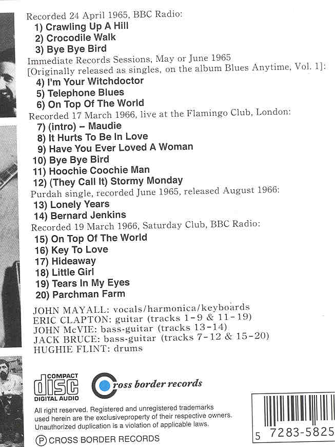1) Crawling Up A Hill 2) Crocodile Walk 3) Bye Bye Bird Immediate Records Sessions; May or June 1965 [Originally released as singles, on the album Blues Anytime, Vol. 1]: 4) I’m Your Witchdoctor 5) Telephone Blues 6) On Top Of The World Recorded 17 March 1966, live at the Flamingo Club, London: 7) (intro) — Maudie 8) It Hurts To Be In Love 9) Have You Ever Loved A Woman 10) Bye Bye Bird 11) Hoochie Coochie Man 12) (They Call It) Stormy Monday Purdah singl•, recorded June 1965, released August 1966: 13) Lonely Years 14) Bernard Jenkins Recorded 19 larch 1966, Saturday Club, BBC Radio: 15) On Top Of The World 16) Key To Love 17) Hideaway 18) Little Girl 19) Tears In My Eyes 20) Parchman Farm