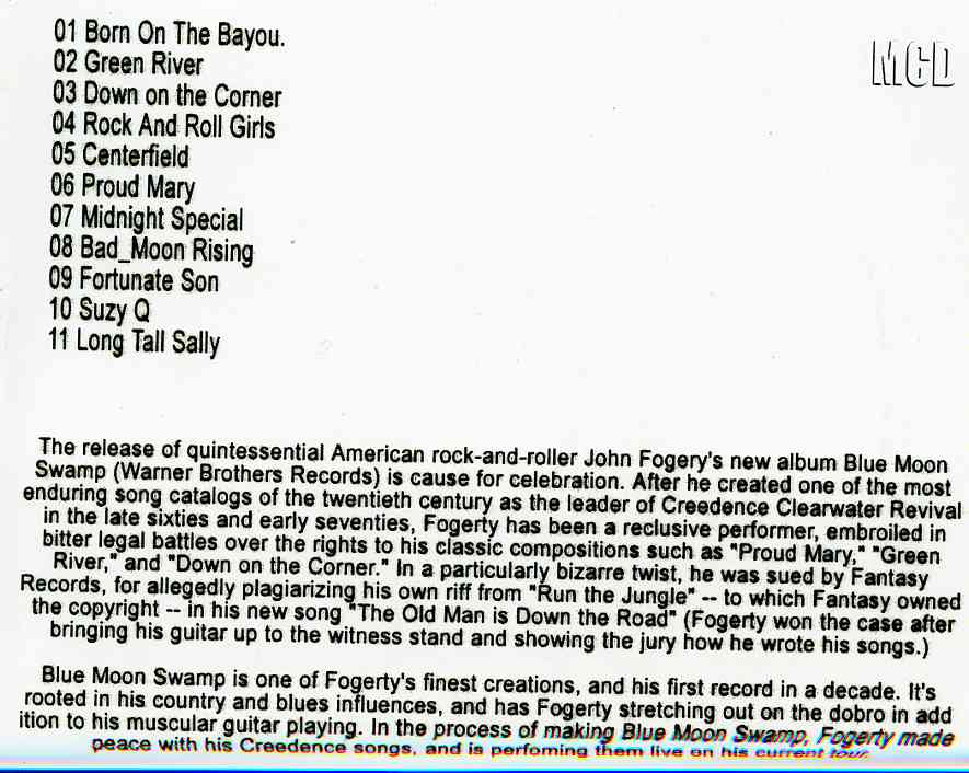 01 Born On The Bayou. 02 Green River 03 Down on the Corner 04 Rock And Roll Girls 05 Centerfield 06 Proud Mary 07 Midnight Special 08 Bad_Moon Rising 09 Fortunate Son 10 Suzy Q 11 Long Tall Sally