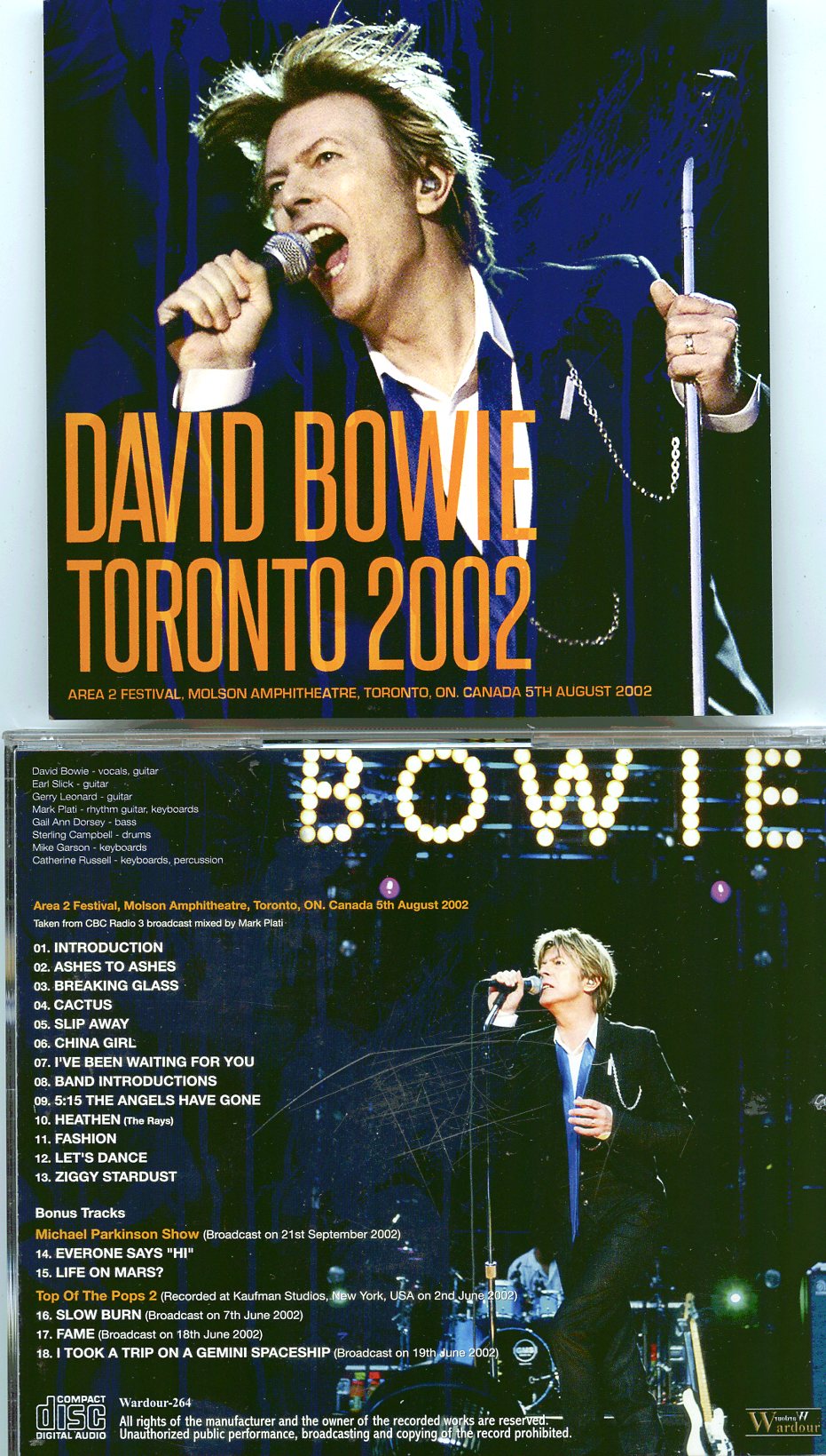 DAVID BOWIE Toronto 2002 1 CD WARDOUR Area 2 Festival Molson Amphitheatre Toronto ON Canada August 5th 2002 + Bonustracks DAVIDBOWIE Toronto 2002( 1 CD )( WARDOUR ) ( Area 2 Festival , Molson Amphitheatre, Toronto, ON, Canada, August 5th, 2002 + Bonustracks )