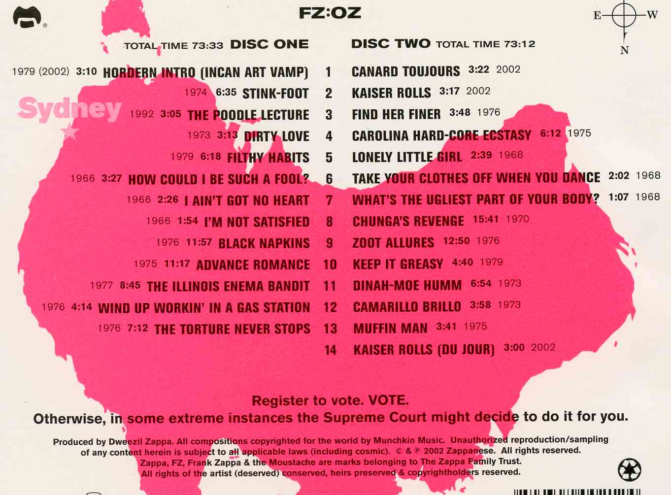 “This is the first in a series of live recordings. […] This is the first official vault release. It is #70 on the official Frank Zappa Masters list. This was the first date of Frank’s last series of appearances onstage in the land of Oz”.