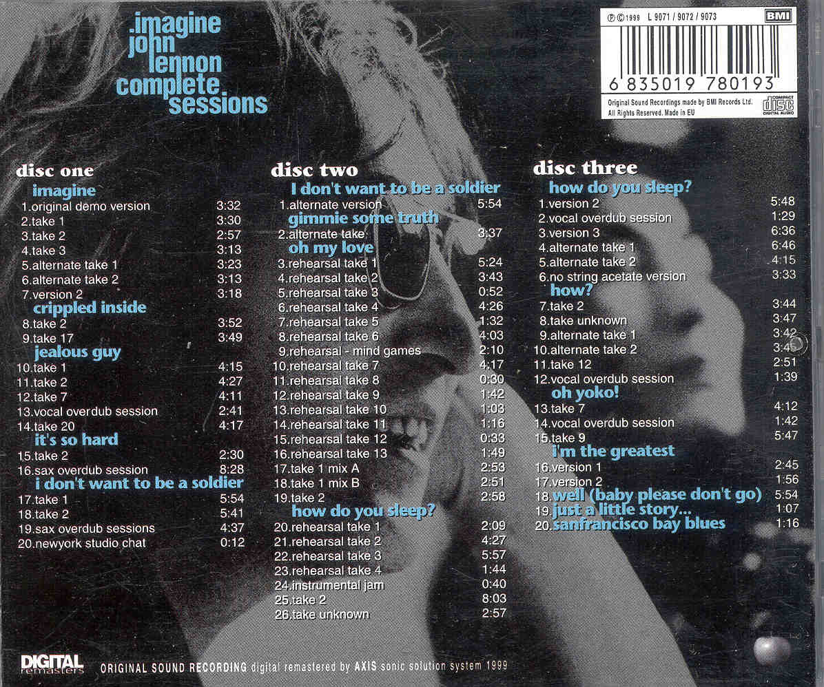disc one imagine 1.orignal demo version 3:32 2.take 1 3:30 3.take 2 2:57 4.take 3 3:13 5.alternate take 1 3:23 6.altemate take 2 3:13 7.version 2 3:18 crippled inside 8.take 2 3:52 9.take 17 r 3:49 jealous guy 10.take 1 4:15 11.take 2 4:27 12.take 7 4:11 13.vocal overdub session 2:41 14.take 20 4:17 its so hard 15.take 2 2:30 16.sax overdub session 8:28 i don’t want to he a soldier 17.take 1 5:54 18.1ake 2 5:41 19.sax overdub sessions 4:37 20.newyork studio chat 0:12