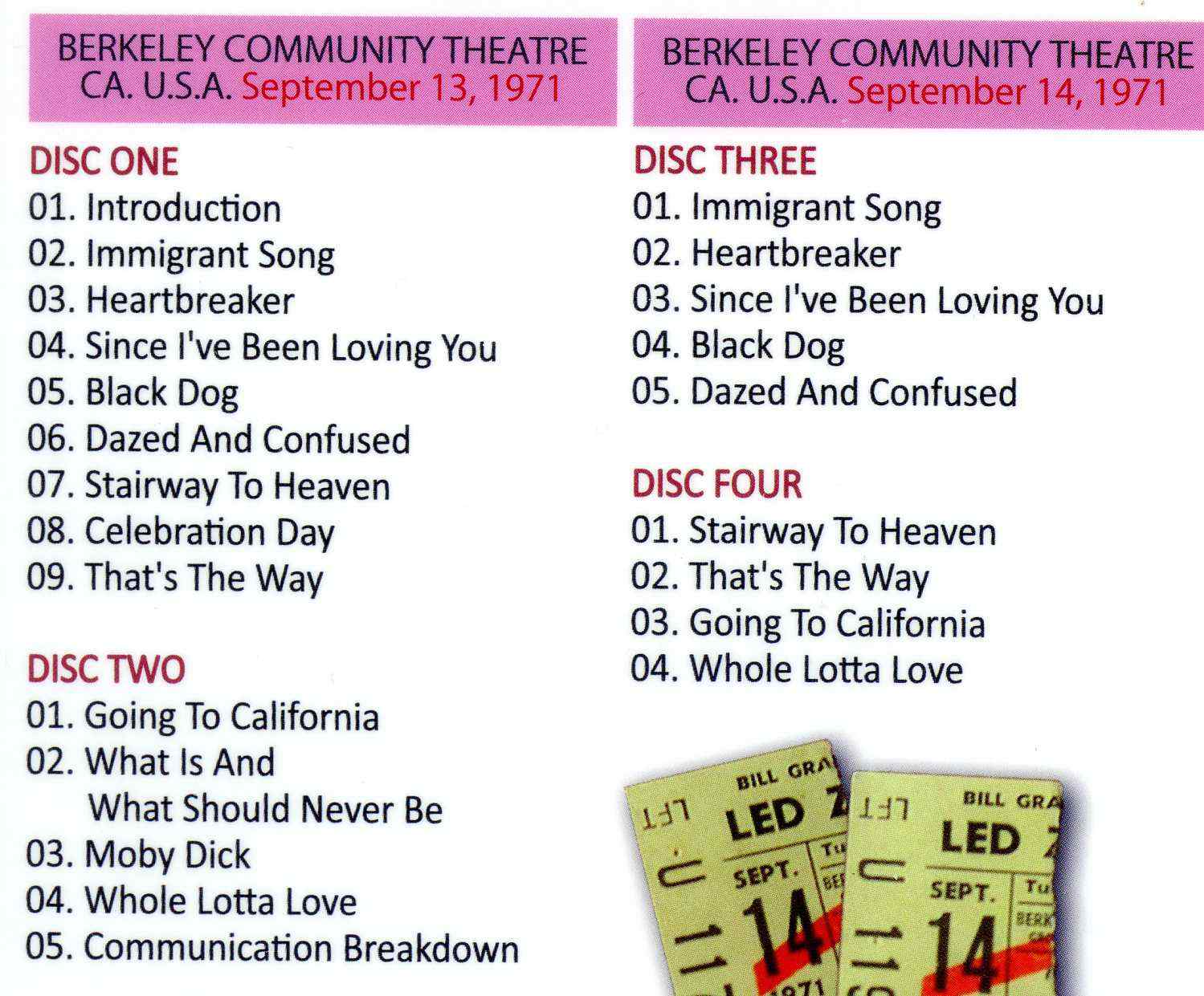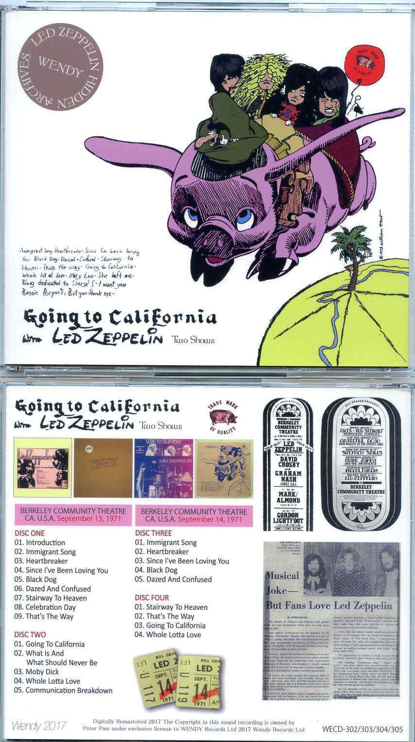 Led Zeppelin Going To California Two Shows 4 cd set Wendy Berkeley CA USA Sep. 13th & 14th 1971 Led Zeppelin Going To California Two Shows ( 4 cd set )( Wendy ) ( Berkeley , CA , USA , Sep. 13th & 14th , 1971 )