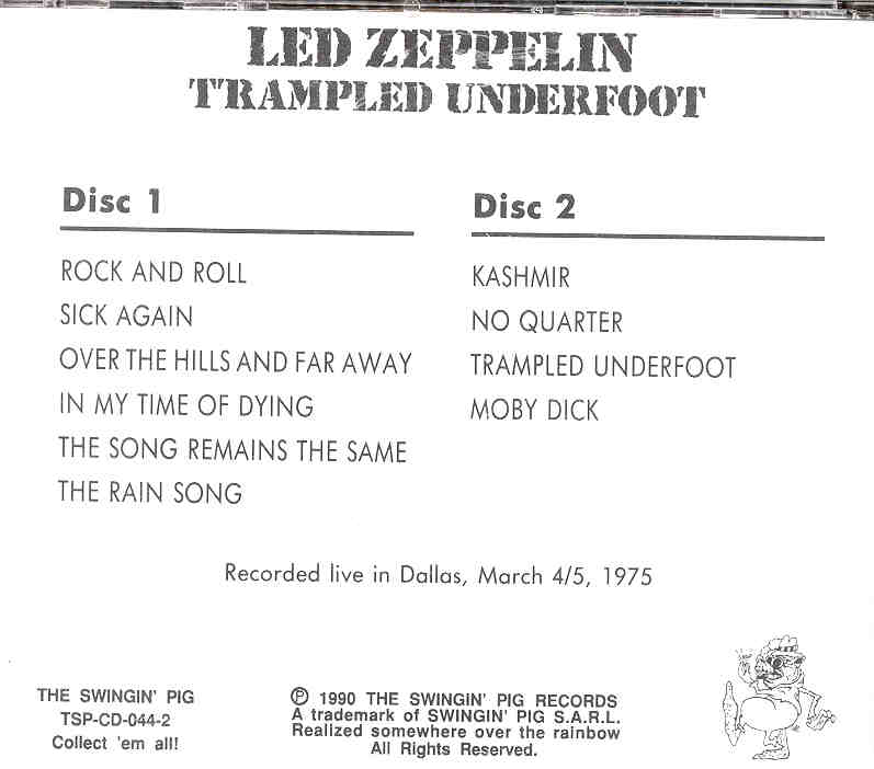 Led Zeppelin Trampled Underfoot 2 CD set Swingin Pig Dallas Texas USA March 4th 1975 Led Zeppelin Trampled Underfoot ( 2 CD set ) ( Swingin Pig ) ( Dallas , Texas , USA , March 4th , 1975 )