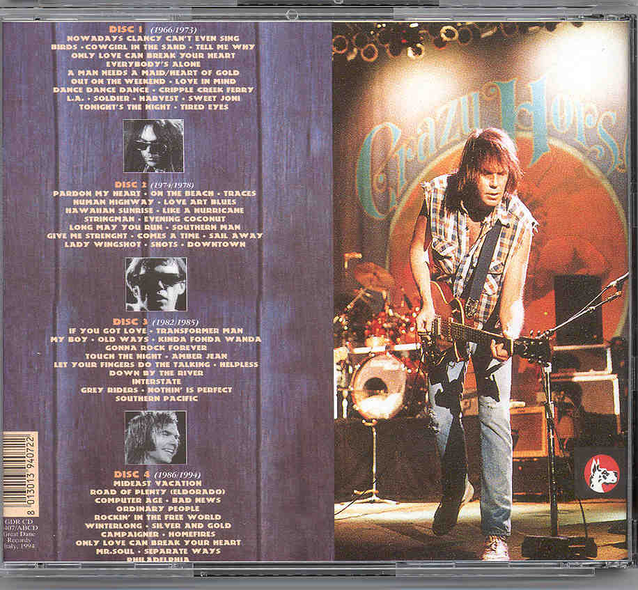 Disc 2 (1974-1978): 1. Pardon My Heart, 2. On the Beach, 3. Traces, 4. Human Highway, 5. Love Art Blues, 6. Hawaiian Sunrise, 7. Like a Hurricane, 8. Stringman, 9, Evening Coconut, 10. Long May You Run, 11. Southern Man, 12. Give Me Strength, 13. Comes a Time, 14. Sail Away, 15. Lady Wingshot, 16. Shots, 17. Downtown