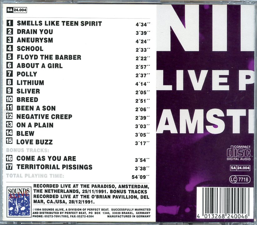 Nirvana On Stage in Europe Performance Live at the Paradiso Amsterdam The Netherlands November 25th 1991 Nirvana On Stage in Europe Performance ( Live at the Paradiso, Amsterdam, The Netherlands, November 25th, 1991 )