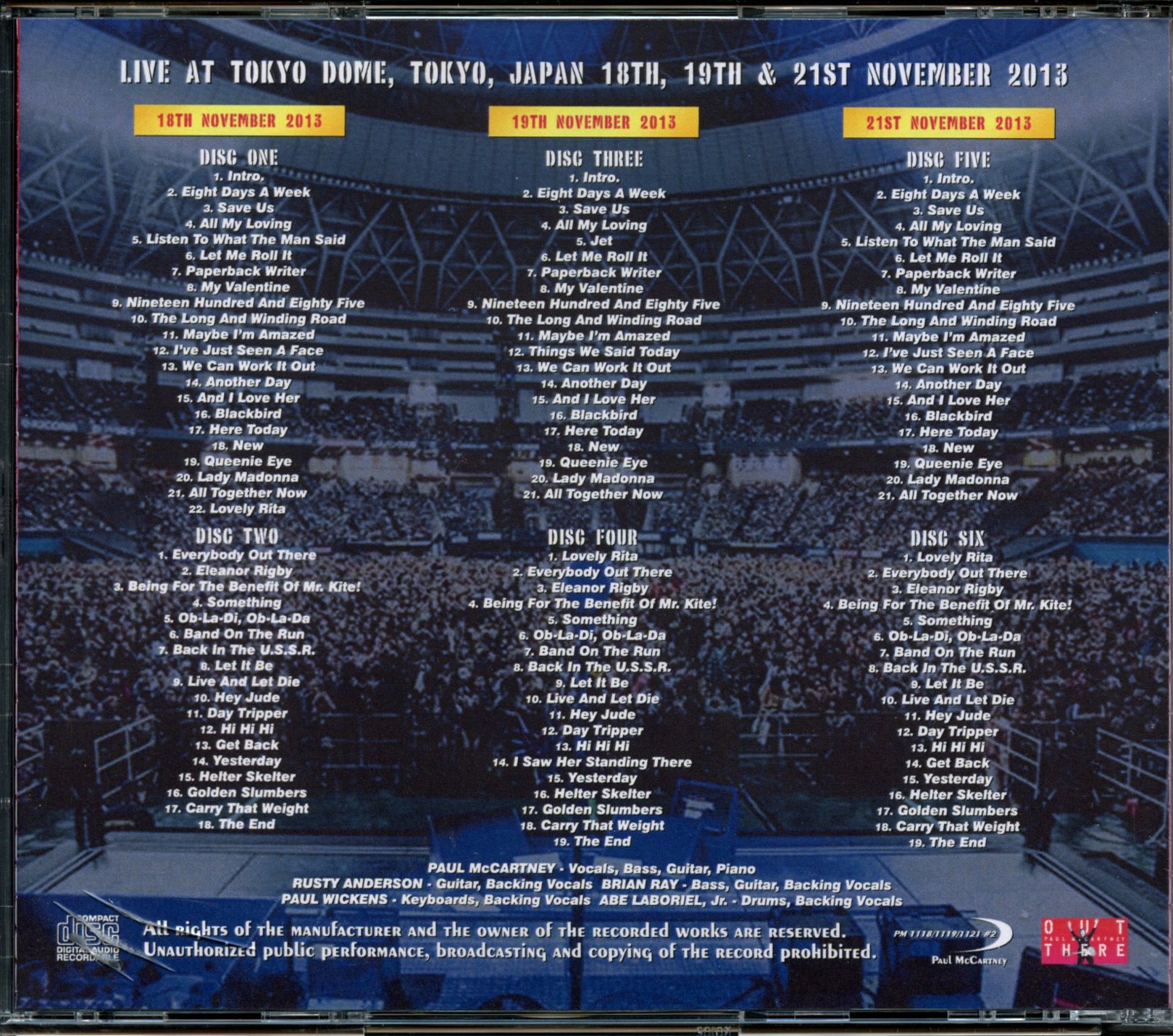 Paul Mccartney Complete Tokyo Dome 2013 # 2 6 CD SET Tokyo Dome Japan November 18th 19th & 21st 2013 Paul Mccartney Complete Tokyo Dome 2013 # 2 ( 6 CD SET ) ( Tokyo Dome, Japan, November 18th, 19th & 21st, 2013 )
