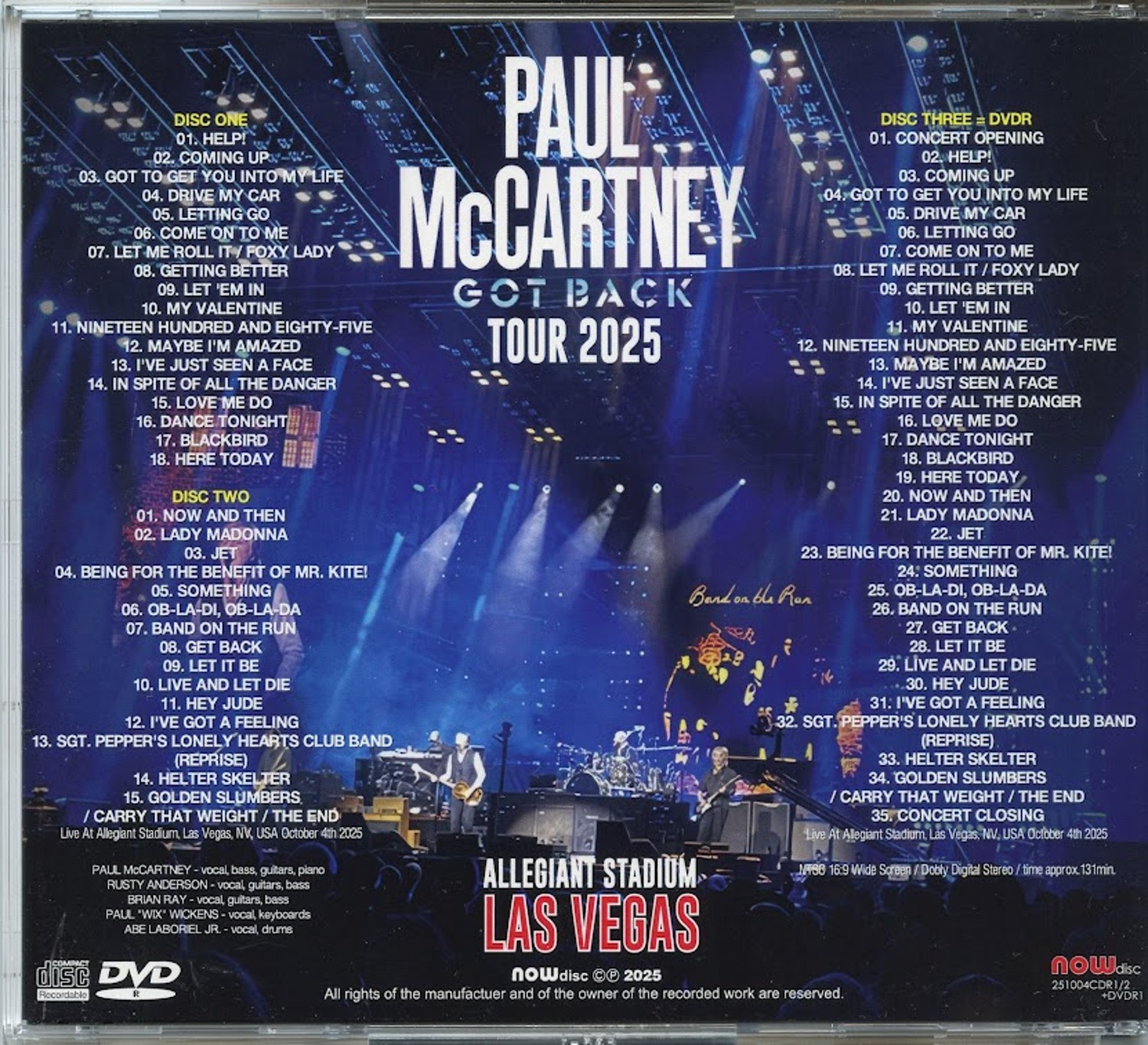 PAUL McCARTNEY – GOT BACK TOUR 2025 Allegiant Stadium Las Vegas ( 2 CD – 1 DVD ) ( NOW DISC ) ( Allegiant Stadium, Las Vegas, NV, USA, October 4th, 2025 )