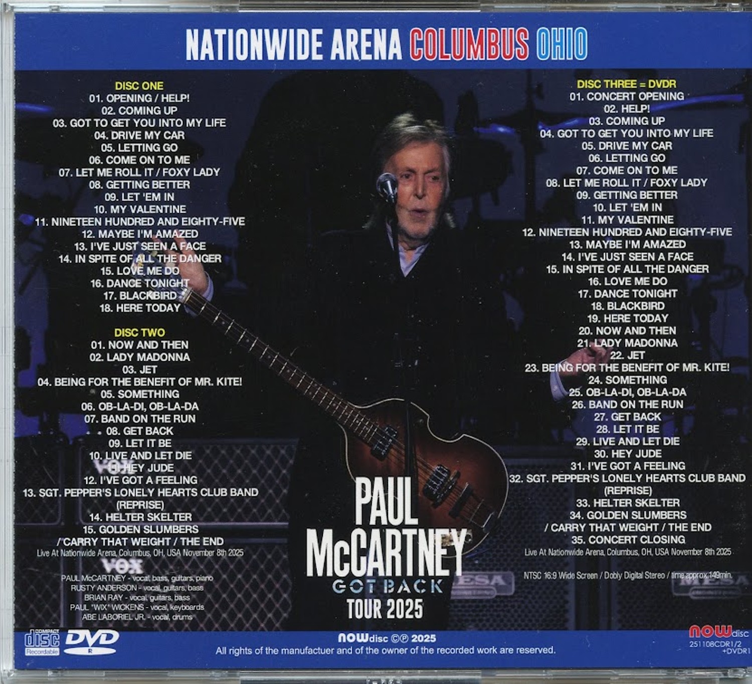 PAUL McCARTNEY – GOT BACK TOUR 2025 Nationwide Arena Columbus Ohio ( 2 CD – 1 DVD ) ( NOW DISC ) ( Nationwide Arena Columbus Ohio, USA, November 8th, 2025 )