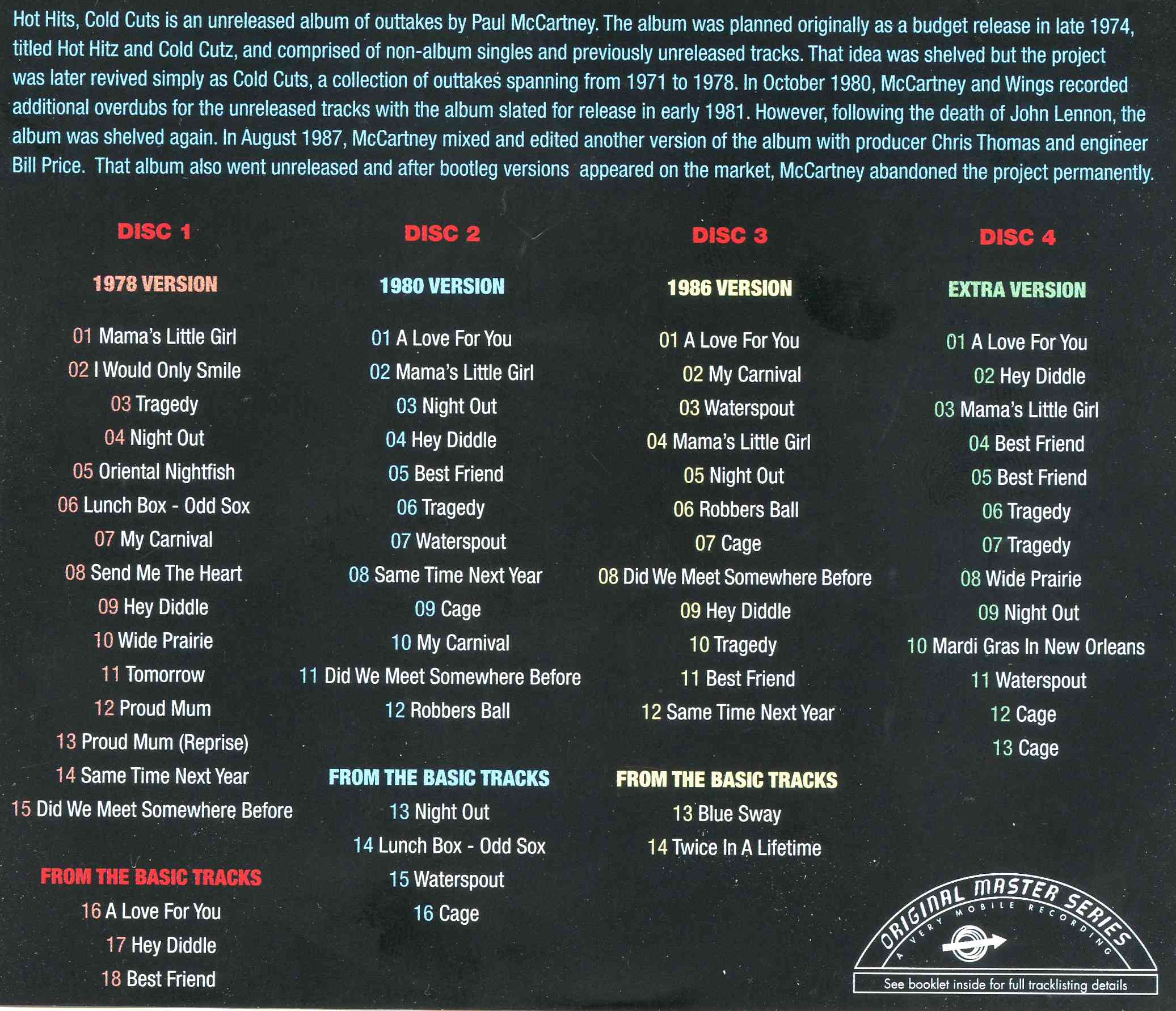 Digitally remastered. Demo studio recordings for abandoned Hot Hits project that started in 1978. McCartney with and without Wings recorded through the years up to 1986 before giving up. This set collects all existing tracks from each session from every year. Pressed on 24k gold discs. Packaged in a fat boy jewel case with an outer slipcase. Comes with 56-page colour booklet.