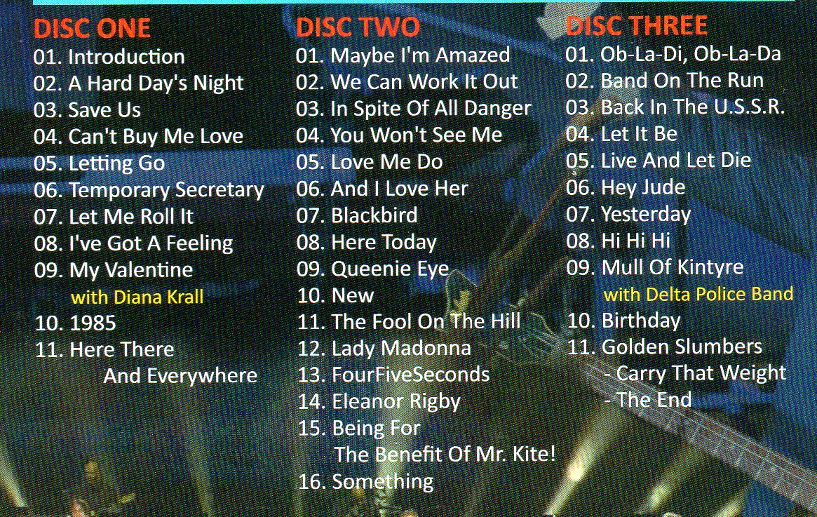 01. Ob-La-Di, Ob-La-Da 02. Band On The Run 03. Back In The U.S.S.R. 04. Let It Be 05. Live And Let Die 06. Hey Jude 07. Yesterday 08. Hi Hi Hi 09. Mull Of Kintyre with Delta Police Band 10. Birthday 11. Golden Slumbers – Carry That Weight – The End