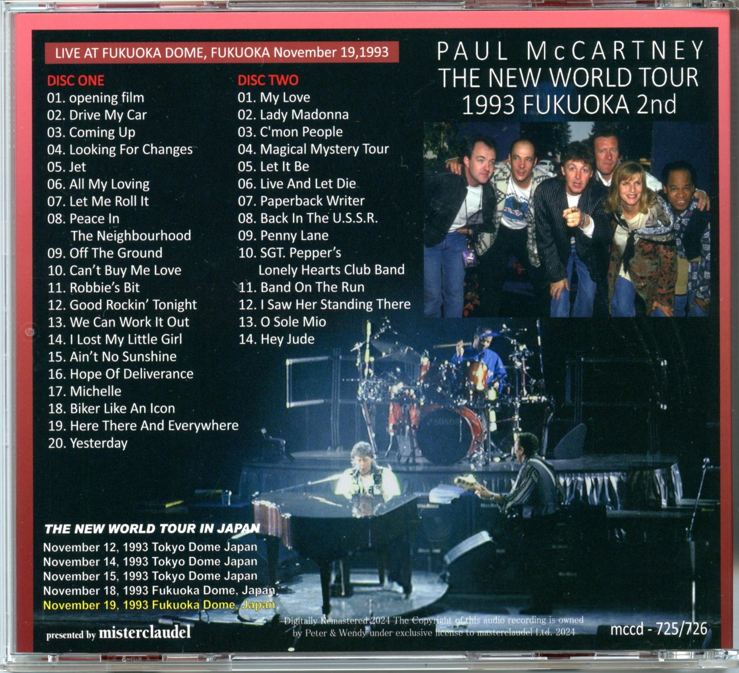 PAUL McCARTNEY – The New World Tour 1993, Fukuoka 2nd ( 2 CD SET ) ( 2025 Misterclaudel ) Live at Fukuoka Dome, Fukuoka, Japan, November 19th, 1993