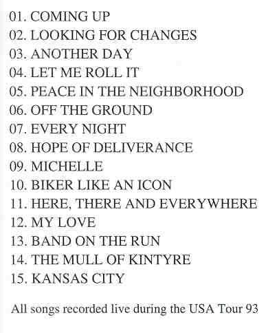 01. COMING UP 02. LOOKING FOR CHANGES 03. ANOTHER DAY 04. LET ME ROLL IT 05. PEACE IN THE NEIGHBORHOOD 06. OFF THE GROUND 07. EVERY NIGHT 08. HOPE OF DELIVERANCE 09. MICHELLE 10. BIKER LIKE AN ICON 11. HERE. THERE AND EVERYWHERE 12. MY LOVE 13. BAND ON THE RUN 14. THE MULL OF KINTYRE 15. KANSAS CITY