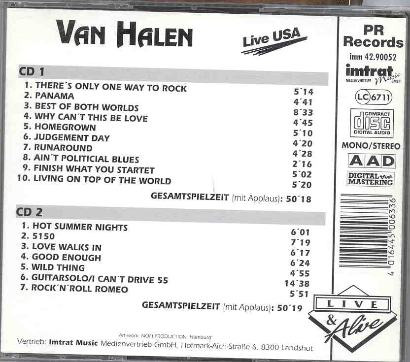 Van Halen Live USA 2 CD set Van Halen Live USA ( 2 CD set )