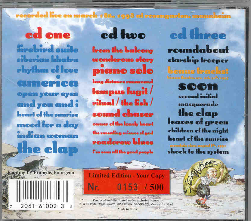 Tracks 1-1 to 3-2 recorded live at the Rosengarten mannheim March 18th 1998